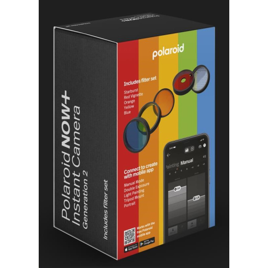 Polaroid Now Gen2 je k dispozici ve 4 zářivých barvách včetně černé, černobílé, červené a modré. Součástí balení je řemínek na zápěstí a nabíjecí USB kabel.