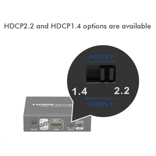 Umožní oddělit audio z HDMI2.0 vstupu na analogové / digitální audio, které je vyvedeno zvlášť na konektory: stereo jack, Digitální audio RCA CINCH nebo digitální optické TOSLINK (SPDIF)