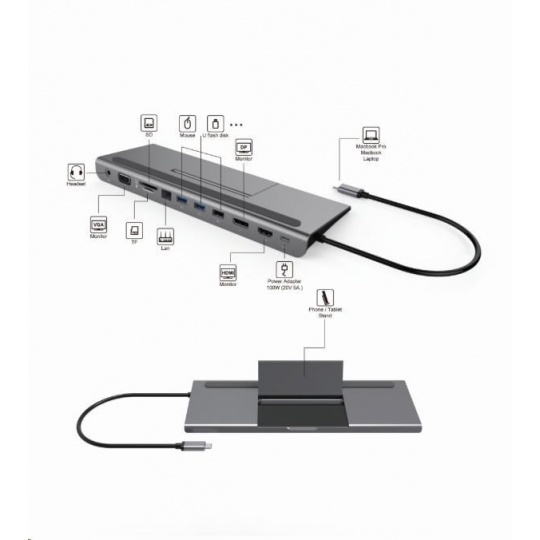 Dokovací stanice může sloužit jako podložka pod notebook, obsahuje čtečku SD karet, konektor RJ45 na připojení na počítačovou síť, 2x USB3.0 + 1x USB2.0, PD konektor 100W konektory a výstup audio na sluchátka nebo do reproduktorů.