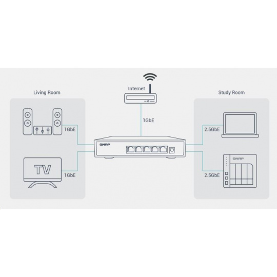 S pěti porty 2,5GbE switch QNAP QSW-1105-5T okamžitě upgraduje vaši síť tak, aby mohla využívat výhody zařízení podporujících 2,5GbE a NAS, aniž by byly nutné jakékoli nové síťové kabely. Zařízení QSW-1105-5T nabízí téměř tiché provedení bez ventilátoru a zapojení typu plug-and-play. Funkce detekce a blokování síťové smyčky umožňuje snadné vytvoření dostupného vysokorychlostního síťového prostředí pro váš domov nebo podnik.