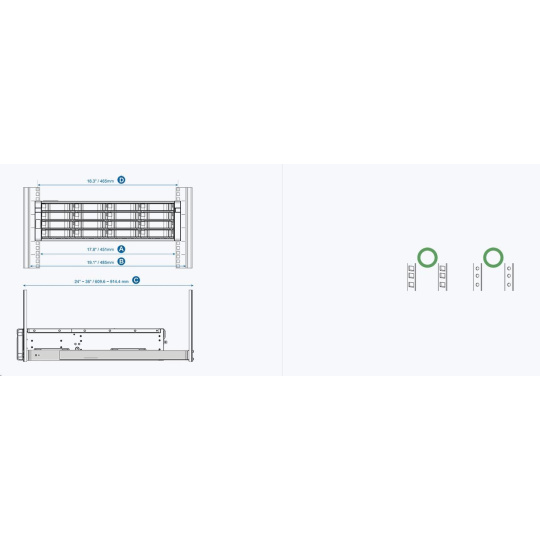 Sady kolejnic QNAP Rail Kits pomáhají při instalaci QNAP NAS do racku. Posuvné kolejnice umožňují zasunutí QNAP NAS dovnitř a vysunutí ven pro snadnou údržbu a správu. Modely QNAP NAS určené do racku vyhovují standardům rackové montáže ANSI/EIA-RS-310-D. Než nakoupíte serverový rack, nejprve se prosím ujistěte, zda tento serverové rack odpovídá příslušným specifikacím.
