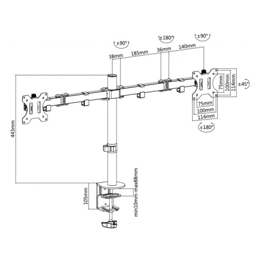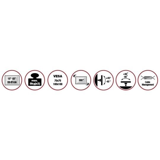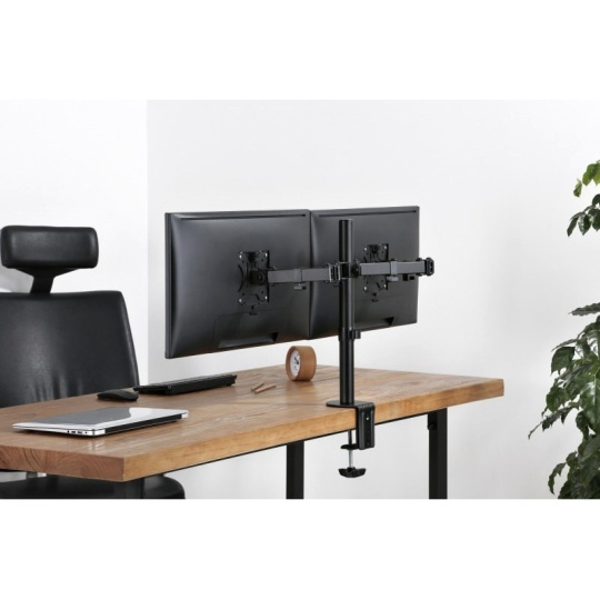 Stolní držák s upevňovací klemou pro 2x LCD monitor s uhlopříčkou 13"- 32" a hmotností maximálně 8kg na rameno. 2x 39,9cm rameno - 3x pant, vertikálně výklopný +45°/-45° a horizontálně +90°/-90°, otočení monitorů o 90°, výška středového sloupku 44,3cm. Uchycení VESA: 75x75, 100x100. Možnost uchycení kabeláže..