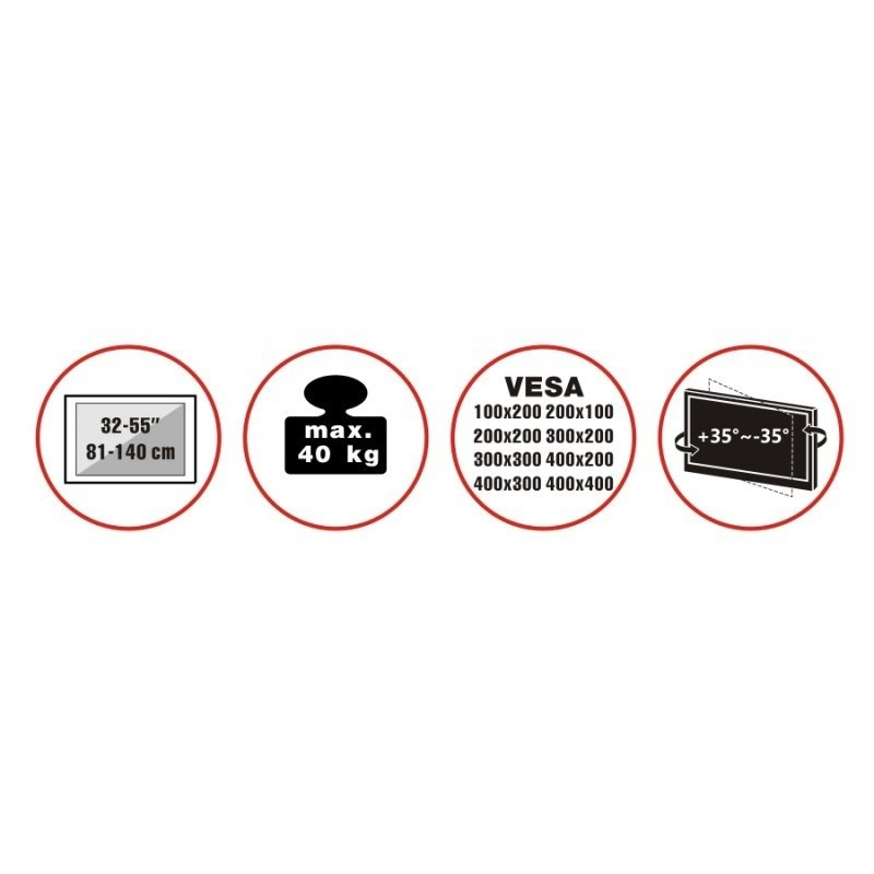 Televizní stojan na nábytek pro velké TV s uhlopříčkou 32"- 55" (81-140cm) a hmotností maximálně 40kg. Středový nosný profil na skleněné ploše, výška včetně TV 142,5-152,5cm, držák vertikálně výklopný +0°/-35° a otočný +35°/-35°, rozměry 43x28x67cm, materiál sklo/ocel, barva černá. Uchycení VESA: 100x200, 200x100, 200x200, 300x200, 300x300, 400x200, 400x400..