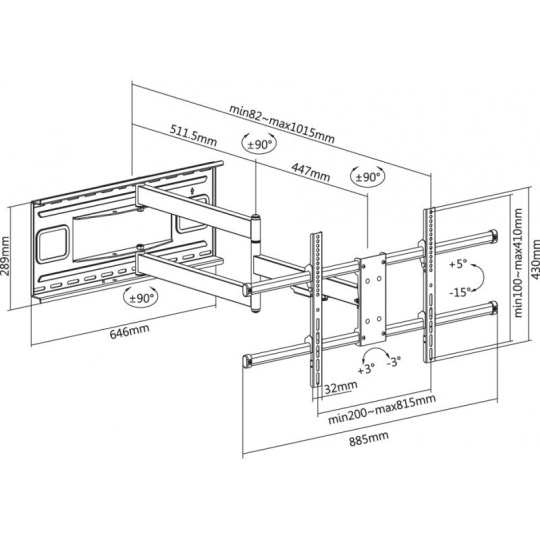 Nástěnný ocelový XL držák s bočním natáčením na LCD TV s uhlopříčkou 43"- 80" (109-203cm) a hmotností maximálně 50kg. 3x pant, vertikálně výklopný +5°/-15° a horizontálně otočný +90°/-90°, vzdálenost od stěny 82-1015mm, vodováha, Cable Managment, materiál ocel, barva černá. Uchycení VESA: 200x200, 300x200, 400x200, 300x300, 400x300, 400x400, 600x400, 800x400..