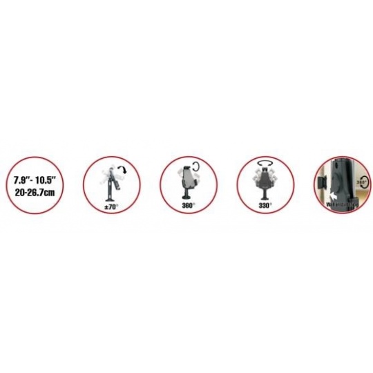 Bezpečnostní uchycení pro tablety 7,9-10,5" na stůl a na stěnu. Nastavitelný sklon tabletu rozmezí +70/-70° a navíc otočný 360°, fixace vruty ke stolu - 330° otočné kolem osy, hmoždinky do zdi, ocelové lanko proti odcizení, kabelový prostup, černý..