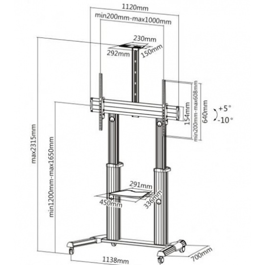 Moderní televizní stolek na Plasma a LCD TV s uhlopříčkou 60"- 100" (152-254cm) a hmotností maximálně 100kg. 2x teleskopická nosná tyč na kolečkách, držák otočný o 90° a vertikálně výklopný +5°/-10°, horní výškově nastavitelná plocha pro kameru, polička, AluDesign, barva stříbrná. Uchycení VESA: 200x200, 300x300, 400x200, 400x400, 600x400, 800x400, 800x600, 1000x600..