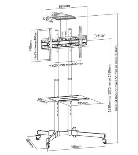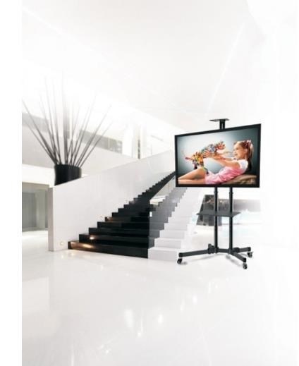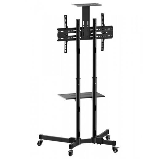 Televizní stolek na Plasma a LCD TV s uhlopříčkou 37"- 70" (94-178cm) a hmotností maximálně 50kg. 2x středová nosná tyč na kolečkách, držák vertikálně výklopný +10°/-10°, horní výškově nastavitelná plocha pro kameru, polička, materiál ocel, barva černá. Uchycení VESA: 200x200, 300x300, 400x200, 400x400, 600x400..