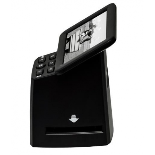 Filmový skener 15,3Mpx CMOS 1/2,3" s barevným 5" TFT LCD monitorem a slotem pro SD-SDXC max 128 GB - možnost práce i bez PC. Rychlý 1s sken, 3200 dpi, interpolace na 22Mpx , PC/MAC, USB2. Součástí balení síťový zdroj 5V/1A, kabel USB, 2x držáky a čistící nástroj. Automatické nebo manuální nastavení expozice a barev. Manuální posun 4 diarámečků (max 3,2mm tloušťka) nebo 6 políček barevného i ČB filmu (negativ/pozitiv) v přiložených držácích. Barevný LCD monitor a SD slot velmi zjednodušují skenování bez nutnosti propojení s počítačem.