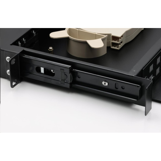 19" rozvaděč, výška 1U, pro 24 simplex adaptérů SC nebo duplexních LC, barva černá, kovová skříň, kazeta na svarky. Vana se vysouvá pomocí pojezdových kolejnic.