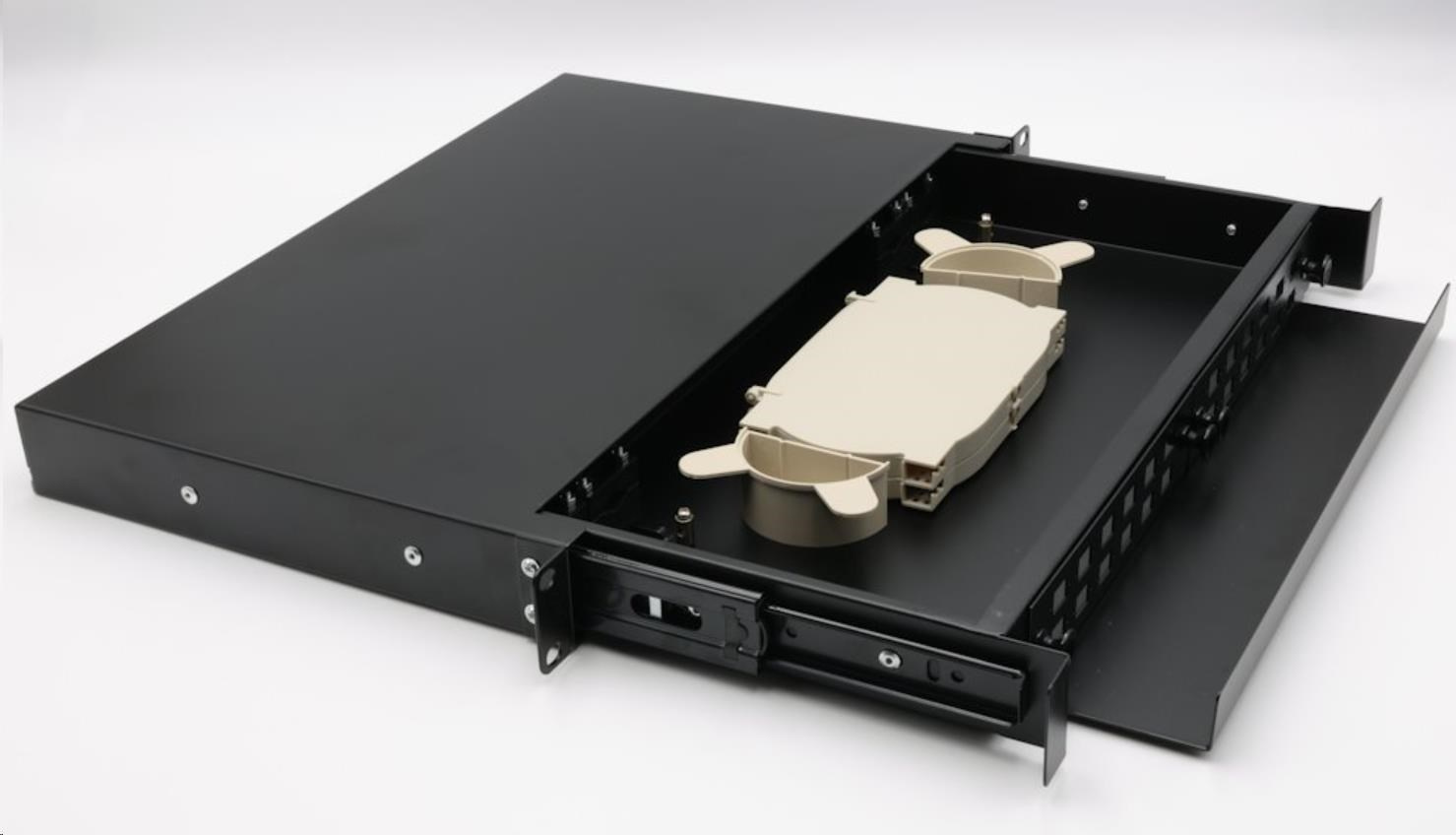 19" rozvaděč, výška 1U, pro 24 simplex adaptérů SC nebo duplexních LC, barva černá, kovová skříň, kazeta na svarky. Vana se vysouvá pomocí pojezdových kolejnic.