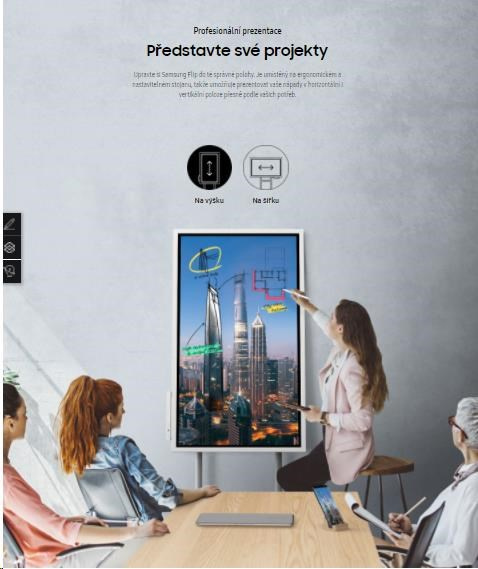 Upravte si Samsung Flip do té správné polohy. Je umístěný na ergonomickém a nastavitelném stojanu, takže umožňuje prezentovat vaše nápady v horizontální i vertikální poloze přesně podle vašich potřeb.