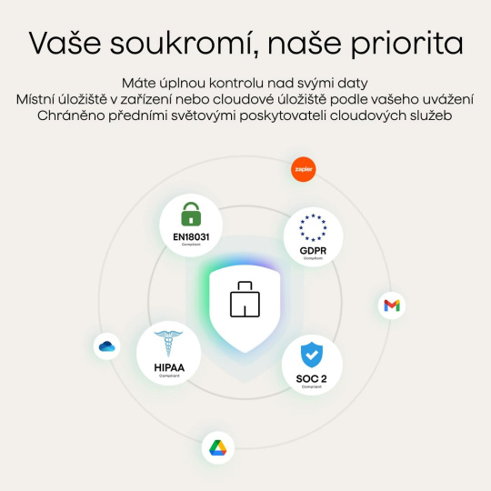 Plaud klade maximální důraz na bezpečnost vašich dat. Používá hosting pouze na serverech Amazon AWS. Navíc jsou rekordéry certifikovány pro soulad s auditním standardem SOC2, zdravotnickým standardem pro nakládání s citlivými daty pacientů HIPAA, celoevropským nařízením o ochraně osobních údajů GDPR a normou EN18031, pro kyberbezpečnost.