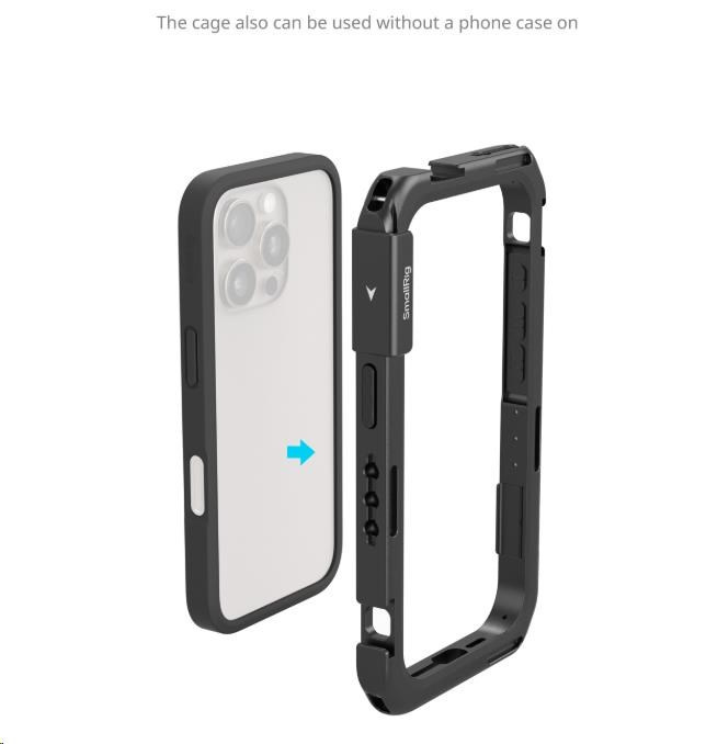 A dedicated mobile video cage for iPhone 16 Pro enables usage with protective phone cases for wide expansion options and all-around phone protection.