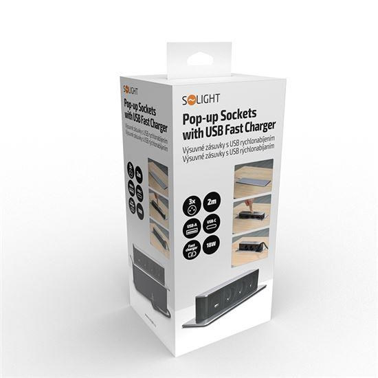 Solight 3z + USB A+C výsuvný blok zásuvek, 2m, nerez ocel