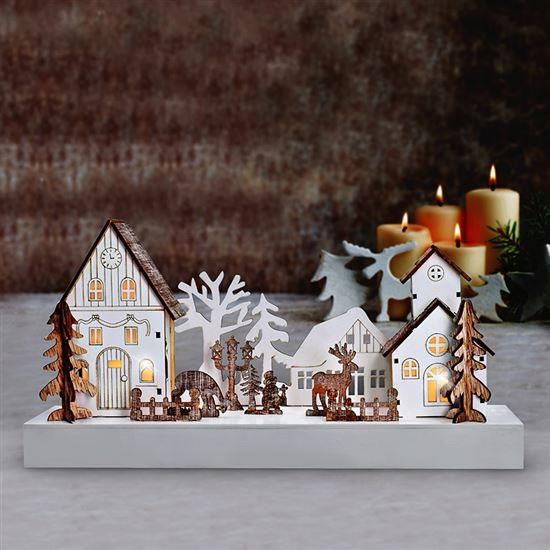 LED vánoční vesnička, počet LED diod: 4, barva světla: teplá bílá, napájení: 2x AA baterie (nejsou součástí), třída ochrany: IP20 (vnitřní použití), rozměry: 34 x 8 x 17cm, materiál: dřevo, barva: bílá, hnědá