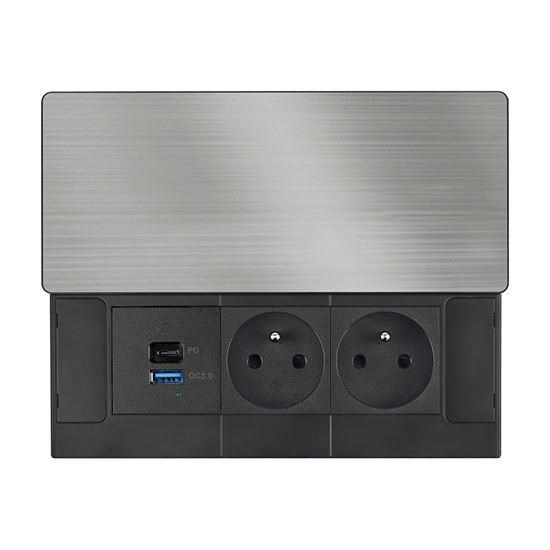 Vrchní kryt z matné tmavé nerez oceli (inox) působí elegantně a přirozeně zapadne do moderního interiéru. Nízký profil, čisté linie a nenápadné posuvné otevírání zachovávají vzhled pracovní plochy. Zásuvky i nabíjecí porty jsou kdykoli snadno přístupné jednoduchým pohybem ruky.
