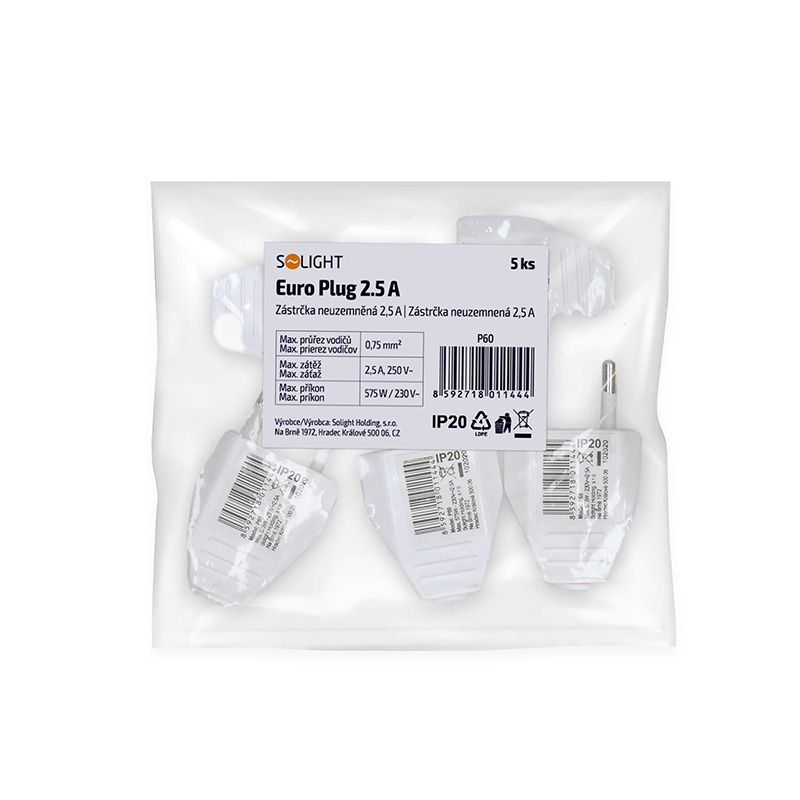 Solight zástrčka plochá 2.5A, přímá, IP20, bílá
