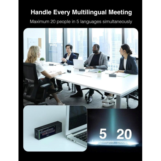 X1 funguje samostatně nebo ve spojení se sluchátky, což přináší maximální flexibilitu pro různé situace. Podporuje připojení až 20 zařízení, která lze snadno synchronizovat do jedné skupinové konverzace. Uživatelé mohou komunikovat v reálném čase a každý slyší překlad ve svém jazyce. Ideální řešení pro firemní porady, workshopy nebo mezinárodní konference. Umožněte svým týmům mluvit svobodně bez jazykových bariér a posilte spolupráci na všech úrovních.
