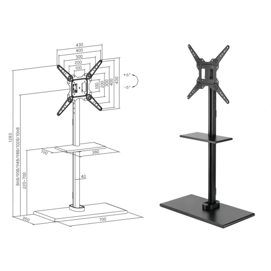 Podlahový stojan / stolek na TV i monitory 23" - 55", nastavení výšky 868 / 908 / 948 / 988 / 1028 / 1068mm, náklon +6° / -6°, podstava 700 x 350mm, polička 380 x 190mm s nastavitelnou výškou 220 - 770mm, instalační materiál, vedení kabeláže, VESA 100x100 až 400x400, nosnost 35kg