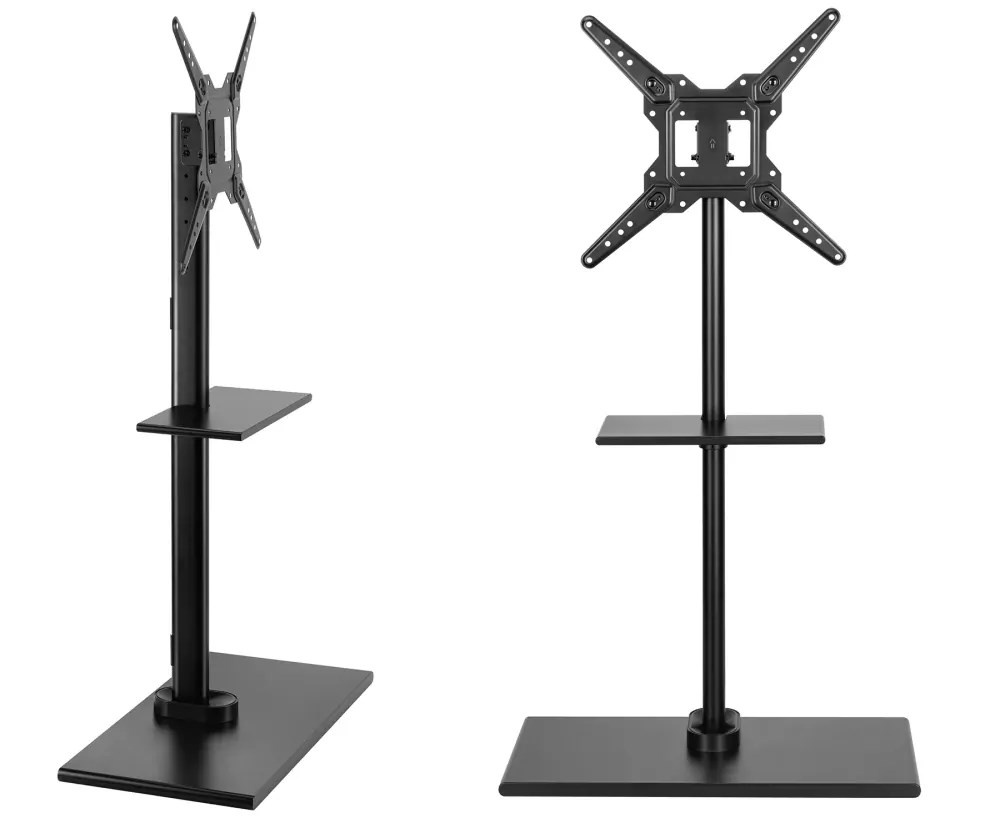 Podlahový stojan / stolek na TV i monitory 23" - 55", nastavení výšky 868 / 908 / 948 / 988 / 1028 / 1068mm, náklon +6° / -6°, podstava 700 x 350mm, polička 380 x 190mm s nastavitelnou výškou 220 - 770mm, instalační materiál, vedení kabeláže, VESA 100x100 až 400x400, nosnost 35kg