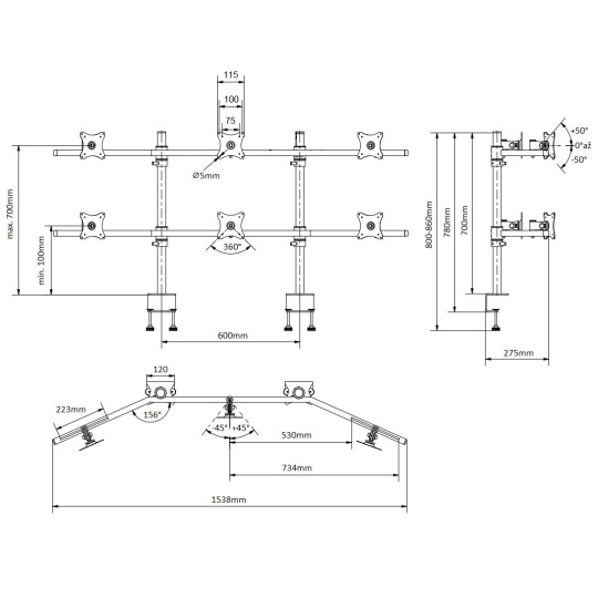 Stolní držák na 6 monitorů Edbak SV17 Stolní držák na 6 monitorů nebo televizorů s úhlopříčkou 17"-27", parabola, plně nastavitelné pozice monitorů, profesionální kvalita, VESA standardy 75x75 a 100x100, barva černá, nosnost 60kg Profesionální parabolický stolní držák na 6 monitorů 17-27". Nastavitelná poloha každého monitoru dle potřeby: otáčení do stran, naklápění, korekce roviny, pivot, posun do stran. Nastavení potřebné výšky vodorovných nosníků s monitory. V balení najdete 2 typy stolních úchytů: svěráky na uchycení na okraje stolů nebo šroubovici pro uchycení do průchodek. Systém vedení kabeláže. Nejvyšší kvalita, silnostěnný materiál. Podpora VESA standardů 75x75 a 100x100, barevné provedení černé, nosnost 60kg. Záruka 10 let. Profesionální stolní držák na 6 monitorů v parabole Edbak SV17 Technické údaje: nosnost 60kg na monitory s úhlopříčkou 17" až 27" VESA standardy 75x75mm a 100x100mm polohování vzdálenosti monitorů mezi sebou 223mm nastavení sklonu +/- 50° otáčení monitoru do stran +/-45° funkce pivot uchycení na stolové desky o síle 10-55mm (průchodka) nebo 10-80mm na okraj stolu nejvyšší kvalita, silnostěnný materiál, profesionální výrobek velmi snadná a rychlá montáž barva černá záruka 10 let Držák na 6 monitorů displejů Edbak SV17 Stojan na 6 monitorů Edbak SV17 podporuje VESA standardy: VESA 75x75 VESA 100x100 možnost zakoupení rozšíření na VESA 200x100 a 100x200 možnost zakoupení rozšíření na VESA 200x200.