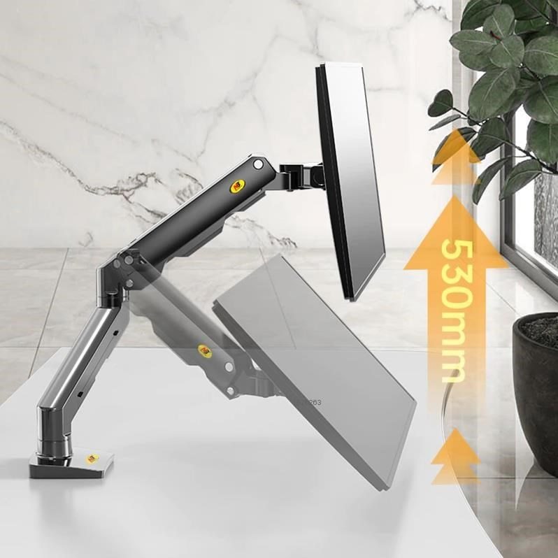 Držák na monitor Tv NB G50 Profesionální stolní držák na širokoúhlý monitor nebo All in One Pc 27-45", otočný +/-180°, sklopný +60°/-15°, nastavitelná výška od stolu 190-475mm, nastavitelná vzdálenost 0-640mm, 1x port USB, 2 typy stolních úchytů, systém vedení kabeláže, VESA stndardy 75x75 a 100x100, nosnost 16kg Jeden z nejkvalitnějších stolních držáků pro zavěšení širokoúhlých monitorů nebo All in One PC - profesionální, poctivá konstrukce, dizajn propracovaný do detailu a velmi snadné polohování. Držák doporučujeme i náročným zákazníkům, do vytížených provozů, kanceláří nebo showroomů. Své uplatnění najde na každém stole. Držák je ideální na širokoúhlé i klasické monitory, All in One Pc nebo televizory s úhlopříčkou 27-45", u širokoúhlých monitorů může být úhlopříčka i větší. Podmínkou je hmotnost v rozmezí 5-16kg, u lehčích obrazovek nebude možné výškové polohování. Držák podporuje VESA 75x75 a 100x100, v případě potřeby nabízíme i rozšíření na 200x100, 100x200 a 200x200. Kompletní polohovatelnost: otáčení +/-180°, naklápění +60°/-15°, snadné nastavení výšky díky plynovému pístu od 195mm až do 475mm, nastavení vzdálenosti od úchytu 0-640mm, funkce pivot, port USB, propracované vedení kabeláže, 2 typy stolních úchytů. Profesionální stolní držák na širokoúhlé monitory a All in One Pc NB G50 Technické údaje: minimální hmotnost monitoru nebo Tv 5kg maximální hmotnost monitoru nebo Tv 16kg podporuje VESA standardy 75x75 a 100x100 doporučená úhlopříčka monitoru Tv 27" až 45" ideální na širokoúhlé monitory, zobrazovací zařízení, All in One Pc nebo televizory otáčení do stran +/- 180° naklápění +60° / -15° nastavení výšky od stolové desky 195mm až 475mm výškové polohování 280mm nastavení vzdálenosti od stolního uchycení 0-640mm funkce pivot - horizontální nebo vertikální otočení obrazovky 1x port USB na základně držáku systém vedení kabeláže 2 typy stolních úchytů (na okraj nebo přes otvor do prostoru) barevné provedení černé záruka 5 let Profesionální stolní držák na širokoúhlý monitor NB G50 Stolní držák na širokoúhlé monitory Tv NB G50 podporuje VESA standardy: VESA 75x75 VESA 100x100.