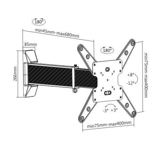 Držák na televize 23-60", teleskopický, otáčení +/-90°, sklopný +8°/-12°, vzdálenost od zdi 45-680mm, VESA 75x75 až 400x400, nosnost 35kg.... více