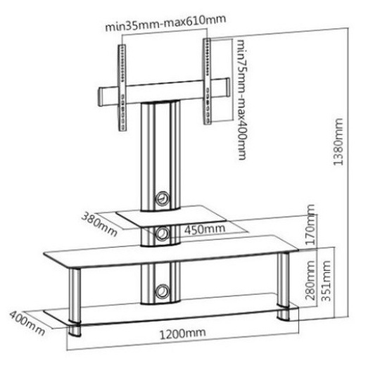 Televizní stolek včetně držáku Tv 37-60", materiál hliník a tvrzené sklo, 2 police 1200x400, horní polička 450x380mm, vedení kabeláže, výška 1180mm, VESA 100x100 až 600x400, nosnost 40kg.... více