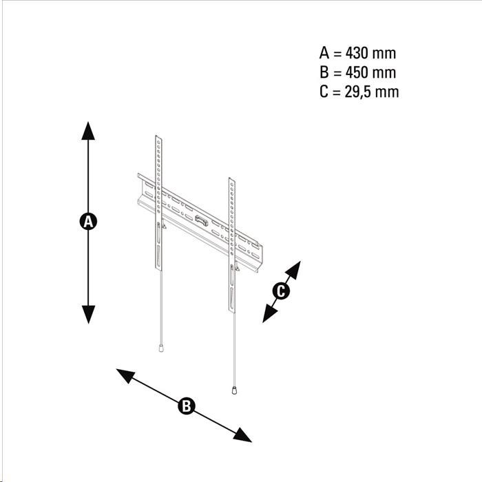 - fixní držák pro LCD obrazovky s úhlopříčkou cca 23" až 56" (58 až 142 cm) - VESA max. 400x400, nastavitelná ramena pro jakoukoliv menší rozteč závitů - snadné zavěšení TV pomocí dvou ramen - max. velikost upevňovacích závitů na TV: M8 - rozměry nástěnného modulu: 45 x 10 cm - hloubka: 3 cm - nosnost: max. 50 kg - kategorie: 1* (základní řada) - barva: černá - včetně vodováhy a montážního příslušenství.