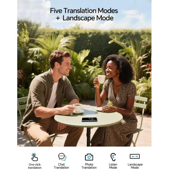 Timekettle T1 nabízí působivou sadu překladových režimů přizpůsobených pro každý scénář. Zažijte nepřerušované, v reálném čase probíhající konverzace 1:1, nebo zapojte více účastníků s intuitivním režimem překladu chatu rozhovorů. Pro vizuální porozumění umožňuje vestavěný 8Mpx fotoaparát okamžitý překlad fotografií, což vám umožní porozumět nápisům, jídelním lístkům a dokumentům jednoduchým cvaknutím. Navíc inteligentní režim poslechu překládá vše, co slyší, a poskytuje nepřetržitý tok porozumění v dynamickém prostředí. Spolu s velkým, živým displejem zajišťuje Timekettle T1, že každá interakce je jasná, přesná a snadno srozumitelná.
