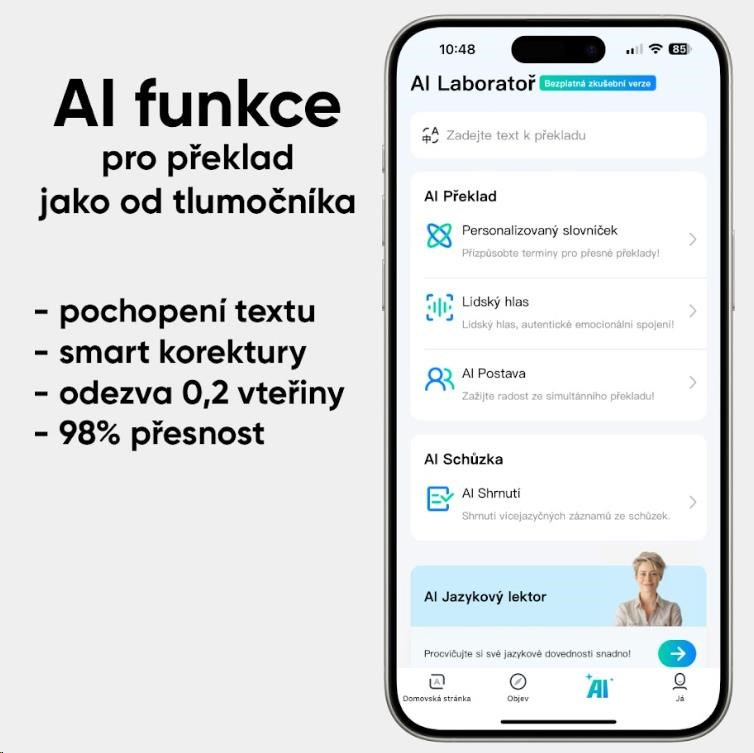 Zajistěte plynulý dialog bez zdlouhavého čekání na překlad - AI asistent v aplikaci vám vytvoří přepis a sumarizaci konverzace