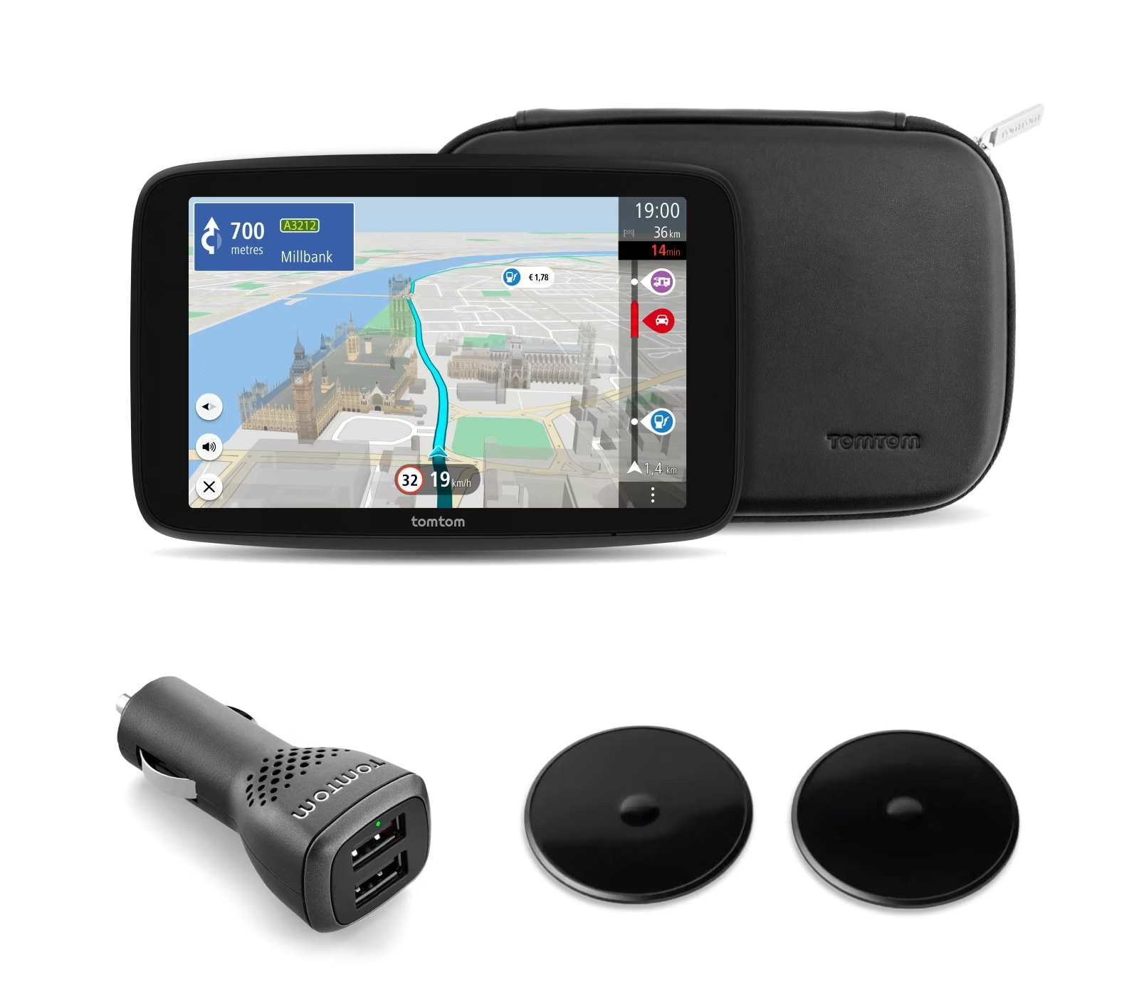 - Obsah balení: Click-and-drive držák, USB-C kabel, duální nabíječka do auta, přilnavé disky, kožené pouzdro, instalační leták