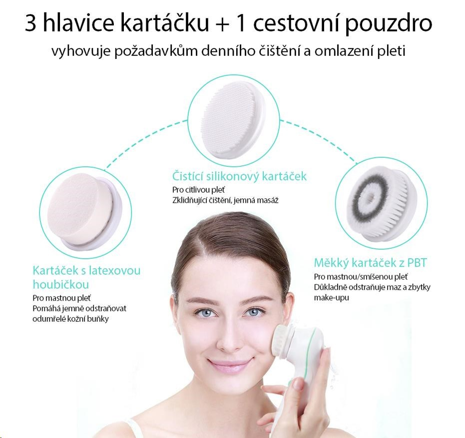 • Silikonový kartáček pro citlivou pokožku, masíruje pleť a zlepšuje krevní oběh