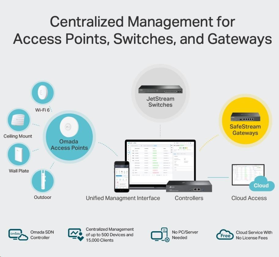 • Centralizovaná správa - až 500 přístupových bodů Omada, 100 switchů JetStream a 100 routerů SafeStream.