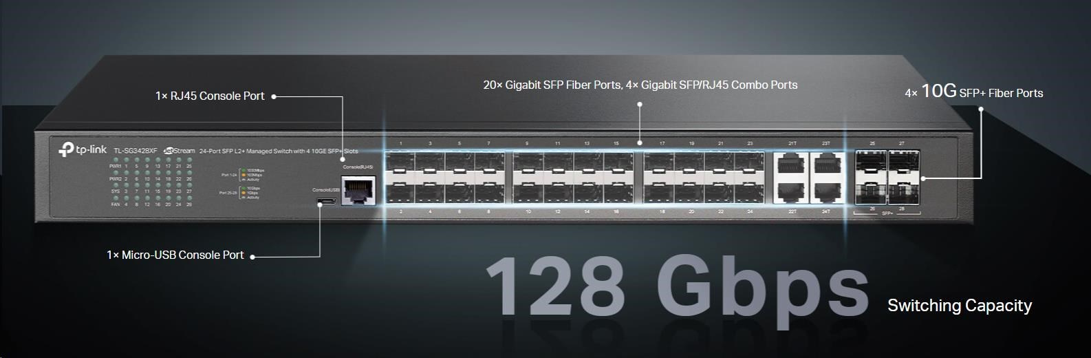 | Interface | • 20× Gigabit SFP Ports • 4× Gigabit SFP/RJ45 Combo Ports • 4× 10G SFP+ Slots • 1× RJ45 Console Port • 1× Micro-USB Console Port |