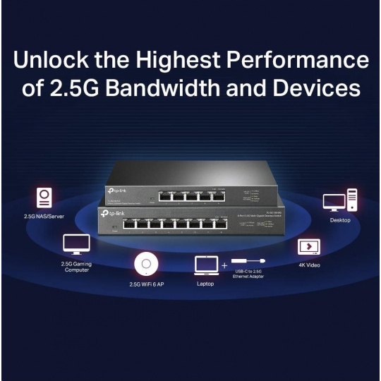 - Osm portů 2,5 Gbit/s. - Osm 2,5gigabitových portů umožňuje využít nejvyšší výkon multigigabitové šířky pásma a vašich zařízení, a poskytuje kapacitu přepínání až 40 Gbit/s.