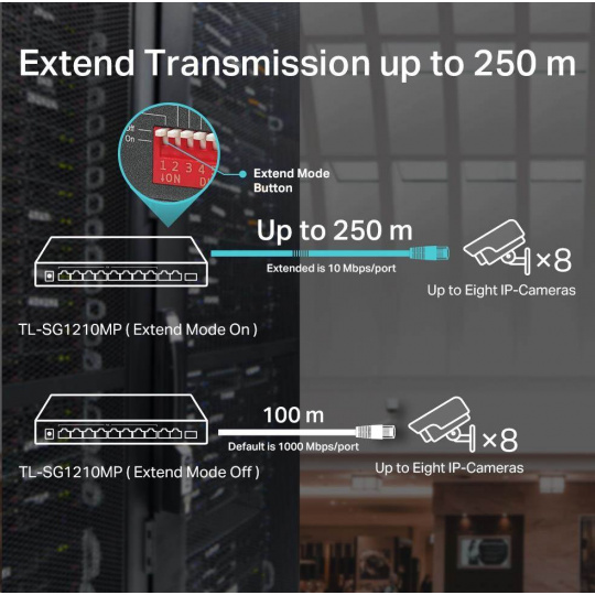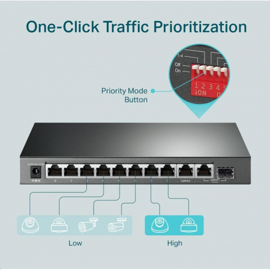 TP-Link CCTV switch TL-SG1210MP (8xGbE, 1xGbE uplink, 1xGbE/SFP combo uplink, 8x PoE+, 123W, fanless)