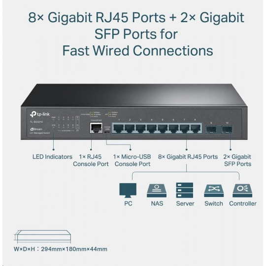 - Plně gigabitové porty -8 gigabitových portů RJ45 a 2 porty SFP poskytují vysokorychlostní připojení.
