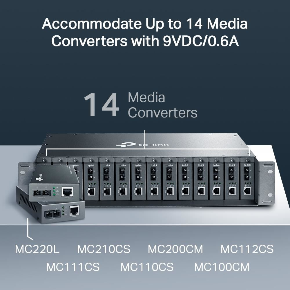 14slotové rackové šasi MC1400 je speciálně určeno pro osazení 14 média konvertorů TP-LINK při zajištění centrálního napájení, úspory místa a napájecích kabelů. Nepřetržitý provoz je pro komunikaci přes optické vedení velmi důležitý, proto lze šasi volitelně osadit redundantním napájecím zdrojem TL-MCRP100**. Funkcí výměny za provozu umožňuje instalaci/odebrání konvertoru/napájecího zdroje bez vypnutí napájení šasi. Navíc pro stabilizaci provozního výkonu a prodloužení životnosti jsou uvnitř instalovány dva chladicí větráky. Společně s řadou MC média konvertorů Gigabit/Fast Ethernet představuje zařízení TL-MC1400 ideální řešení pro vaši síť média konvertorů.