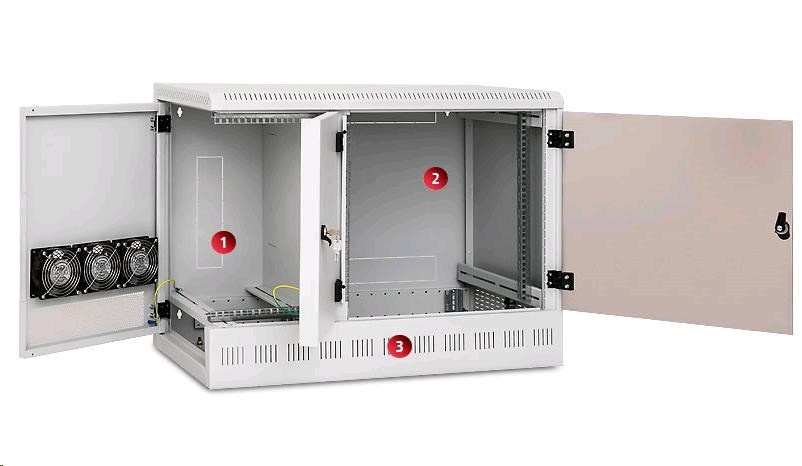 Chlazení provětráváním díky perforaci skeletu a bočních dvířek je možno podpořit instalací ventilátorů pro nástěnné rozvaděče (RAX-CH-X07)