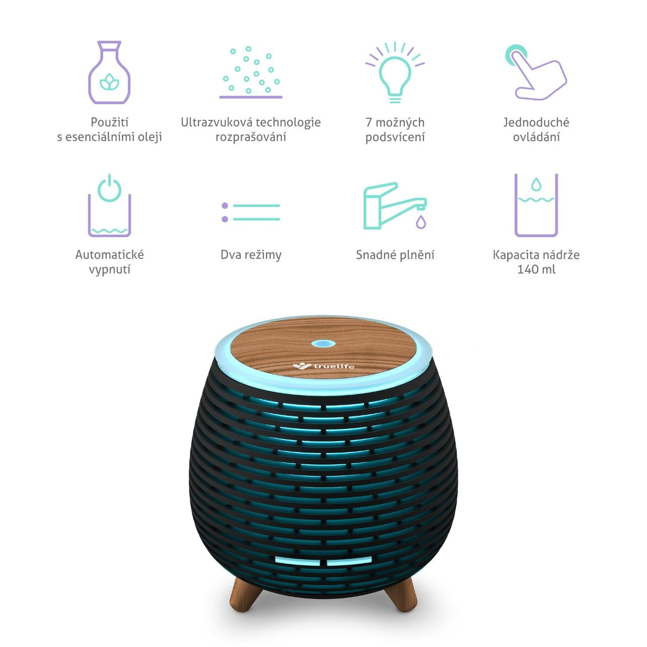 Stačí chvilka a difuzér TrueLife promění vzduch v místnosti, zvlhčí jej a případně naplní příjemnou vůní esenciálního oleje pomocí technologie OilFlow®. Zároveň však umí vytvořit jedinečnou atmosféru díky podsvícení, kde si máte možnost zvolit až ze 7 barevných variant.