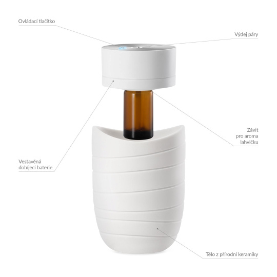 Difuzér působí svým designem i jako dekorace, jeho tělo je vyrobeno z přírodní keramiky.