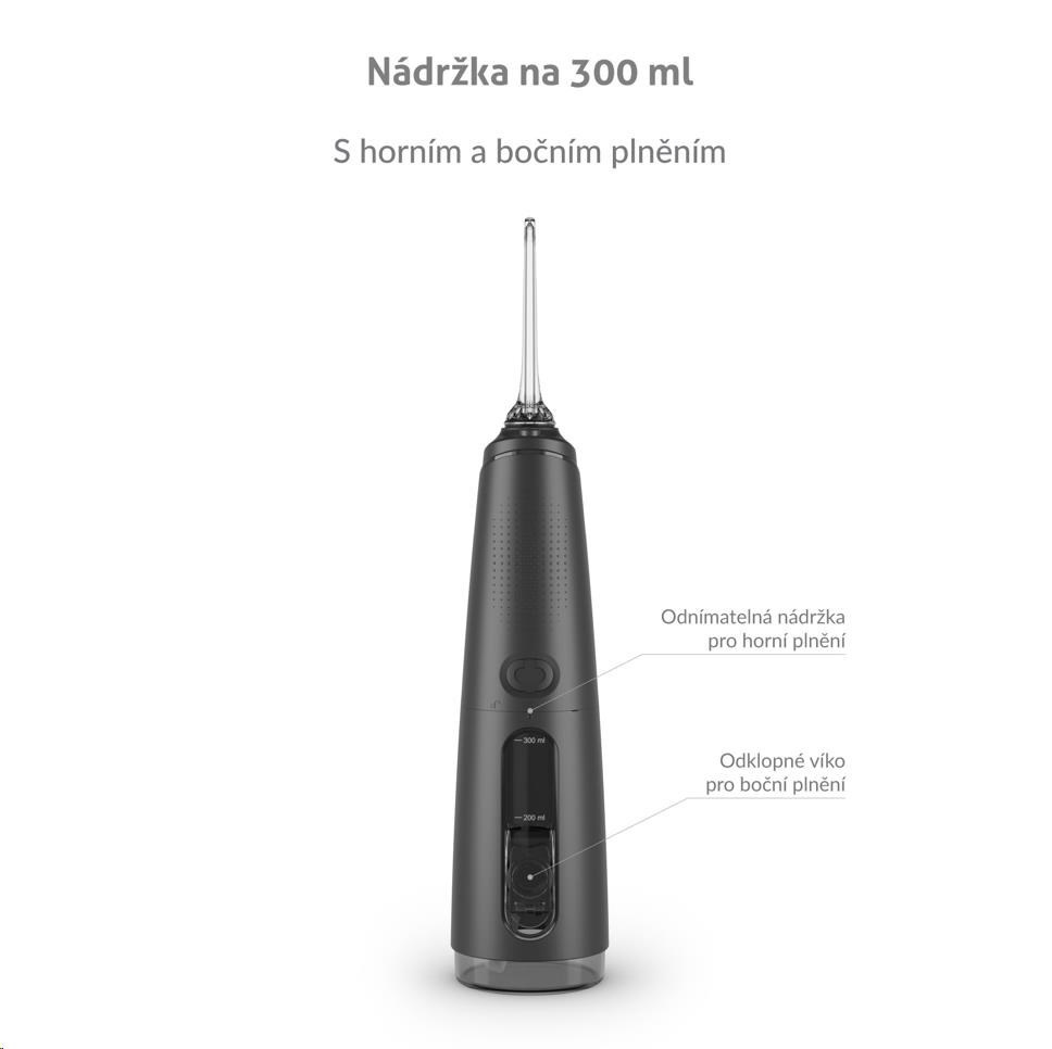 Nádržka o objemu 300 ml vystačí na vyčištění celého chrupu a zároveň je dostatečně kompaktní. Kromě obyčejné vody jí můžete naplnit ústní vodou pro extra svěžest.