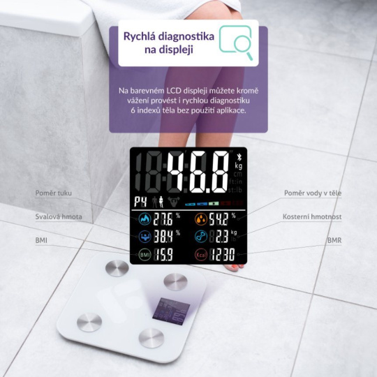Představte si osobní váhu tak chytrou, že vám umožní dokonale poznat vlastní tělo. TrueLife FitScale W6 BT tohle umí. Velice přesně ukáže vaši aktuální hmotnost a přidá spoustu dalších užitečných informací díky bioelektrické impedanční analýze. Vše přehledně vidíte na barevném LCD displeji se 7 indexy těla. Váha je natolik inteligentní, že automaticky rozezná uživatele. Prémiové krycí sklo unese hmotnost až 180 kg. Váha postačí pro rychlou diagnostiku těla, ale pokud vás zajímá popis všech měřených indexů, skvělá je také mobilní aplikace. Stačí propojit váhu přes Bluetooth s telefonem a v aplikaci hned vidíte kompletní tělesný reporting i statistiky.