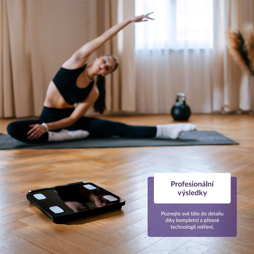Zjistěte o svém těle více než jen pouhou hmotnost. Každý jsme originál a jedinečnou skladbu má i naše tělo, proto o něm chytrá váha TrueLife FitScale W8 BT Black prozradí detaily. Technologie TrueLife PrecisionIQ+® využívá 8 vysoce citlivých senzorů a s pomocí bioelektrické impedanční analýzy změří celkovou tělesnou kompozici. Na přehledném barevném LCD displeji zobrazí celkem 7 údajů - kromě hmotnosti také třeba procento tuku, svalů či vody. Propojením přes Bluetooth s aplikací získáte přehledný report zahrnující 15 tělesných indexů včetně jejich popisu. Váha je schopna sledovat až 16 uživatelů, u kterých v aplikaci zaznamená 15 posledních měření. Každého uživatele automaticky rozezná, takže není třeba nic přepínat. Kdokoliv má však možnost použít váhu i bez aplikace. Prémiové tvrzené krycí sklo je elegantní a velmi odolné s nosností až 180 kg. Při vážení si můžete zvolit jednotky, a to buď kilogramy nebo libry. Vážící odchylka činí pouhých 0,1 kg, takže vaše výsledky budou opravdu přesné.