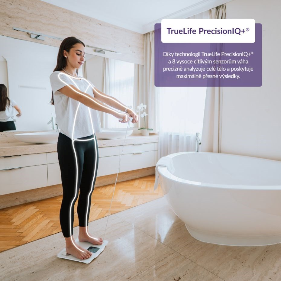 Zjistěte o svém těle více než jen pouhou hmotnost. Každý jsme originál a jedinečnou skladbu má i naše tělo, proto o něm chytrá váha TrueLife FitScale W8 BT White prozradí detaily. Technologie TrueLife PrecisionIQ+® využívá 8 vysoce citlivých senzorů a s pomocí bioelektrické impedanční analýzy změří celkovou tělesnou kompozici. Na přehledném barevném LCD displeji zobrazí celkem 7 údajů - kromě hmotnosti také třeba procento tuku, svalů či vody. Propojením přes Bluetooth s aplikací získáte přehledný report zahrnující 15 tělesných indexů včetně jejich popisu. Váha je schopna sledovat až 16 uživatelů, u kterých v aplikaci zaznamená 15 posledních měření. Každého uživatele automaticky rozezná, takže není třeba nic přepínat. Kdokoliv má však možnost použít váhu i bez aplikace. Prémiové tvrzené krycí sklo je elegantní a velmi odolné s nosností až 180 kg. Při vážení si můžete zvolit jednotky, a to buď kilogramy nebo libry. Vážící odchylka činí pouhých 0,1 kg, takže vaše výsledky budou opravdu přesné.