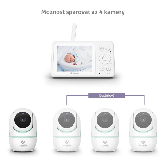 360° rotační chůvička, horizontální i vertikální otáčení, možnost obousměrné komunikace, 3.2“ LCD displej, dosah až 300 m, detekce teploty, připomenutí krmení, noční režim, přednastavené ukolébavky, velká výdrž baterie, VOX režim, připojení až 4 kamer, držák pro uchycení na zeď, kompatibilní s TrueLife NannyCam Holder..... více