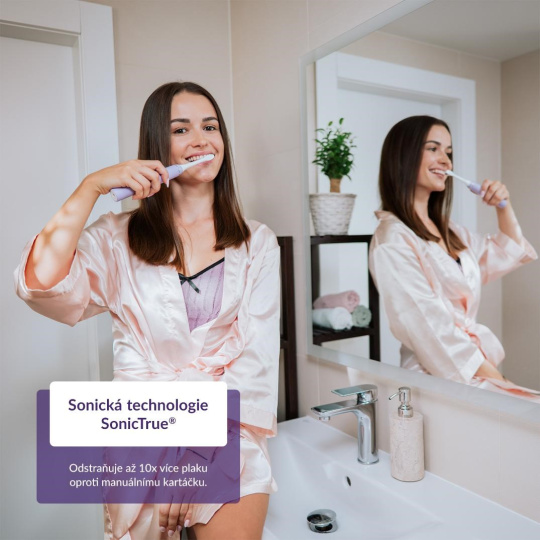 Hlavice kartáčku kmitá ve vysoké frekvenci 70 000 pohybů za minutu. Jemné vibrace nedají šanci zubnímu plaku, pigmentovým skvrnám ani bakteriím. Technologie SonicTrue® je oproti rotačním kartáčkům šetrnější k zubní sklovině. Kartáček zároveň víří pastu s vodou, vhání je do mezizubních prostor a tím je pomáhá čistit.
