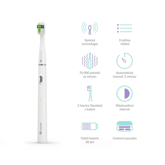 TrueLife SonicBrush Slim20 disponuje sonickou technologií SonicTrue ®, která efektivně a zároveň šetrně pomocí jemných vibrací bojuje proti zubnímu plaku. Hlava kartáčku kmitá rychlostí až 70 000 pohybů za minutu a vířením vody se zubní pastou dochází k čištění i mezizubních a hůře dostupných prostor. Balení obsahuje hned 2 čisticí hlavice, z nichž každá vydrží až 3 měsíce používání. Moment pro její výměnu indikují speciální modré štětiny, které postupně blednou. Máte tak jistotu, že se nesníží účinnost čištění.