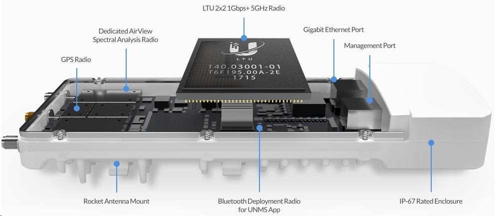 AF-5XHD je v současné době nejvýkonnějším a nejlépe vybaveným airFiber zařízením od Ubiquiti Networks. Revoluční procesor s označením airFiber LTU IC doáže zpracovat přes 2 miliony+ paketů za sekundu při 1Gbps+ (TDD) reálného datového toku v bezlicenčním pásmu 5GHz při 1024QAM (v plánovaném firmwaru je počítáno s podporou až 4096QAM s ještě vyšší propustnosí). Mezi další klíčové vlastnosti můžeme zařadit 2x Gigabit LAN, kdy jeden port je určen pouze pro management, časová synchronizace přes GPS, dedikovaný spektrální analyzér, vysoká odolnost proti vodě (IP67) a nastavitelná šířka kanálu 10/20/30/40/50/60/80 a 100MHz. AirFiber 5XHD je díky velmi dobré konstrukci a přiloženému gumovému adaptéru odolný vůči vodě a je ideální pro jakékoli povětrnostní podmínky.